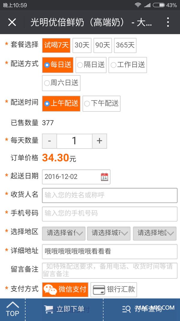第二步:點擊“在線訂購”,確定訂購數量、價格、種類、起送時間、配送地址等信息,下單后微信付款。