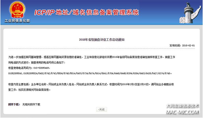 為進一步加強互聯網基礎管理,提高互聯網基礎資源信息的準確性,工業和信息化部組織開展2018年省級網站備案信息準確性抽樣核查工作,抽查工作將電話的方式進行,抽查使用的電話號碼公告如下: