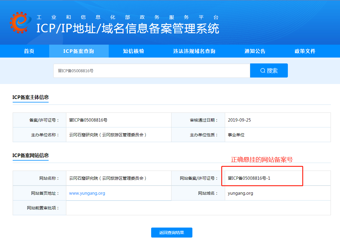 截至目前,宏微技術小哥已經加班加點,為所有用戶免費進行了網站備案號懸掛和鏈接指向修改。因修改涉及客戶數量多,修改范圍廣(此前只要求懸掛主體單位備案號如晉ICP備****號),各家客戶采用的網站系統和數據形式不同,雖反復檢查,仍唯恐遺漏,所以請廣大網站備案用戶務必在電腦端打開網站,查看首頁底部的網站備案號是否為“晉ICP備****號-1”形式,并測試點擊備案號可以打開工信部備案系統https://beian.miit.gov.cn,如出現遺漏或鏈接無法打開,請速速與我們聯系,避免被處罰或取消接入等風險。