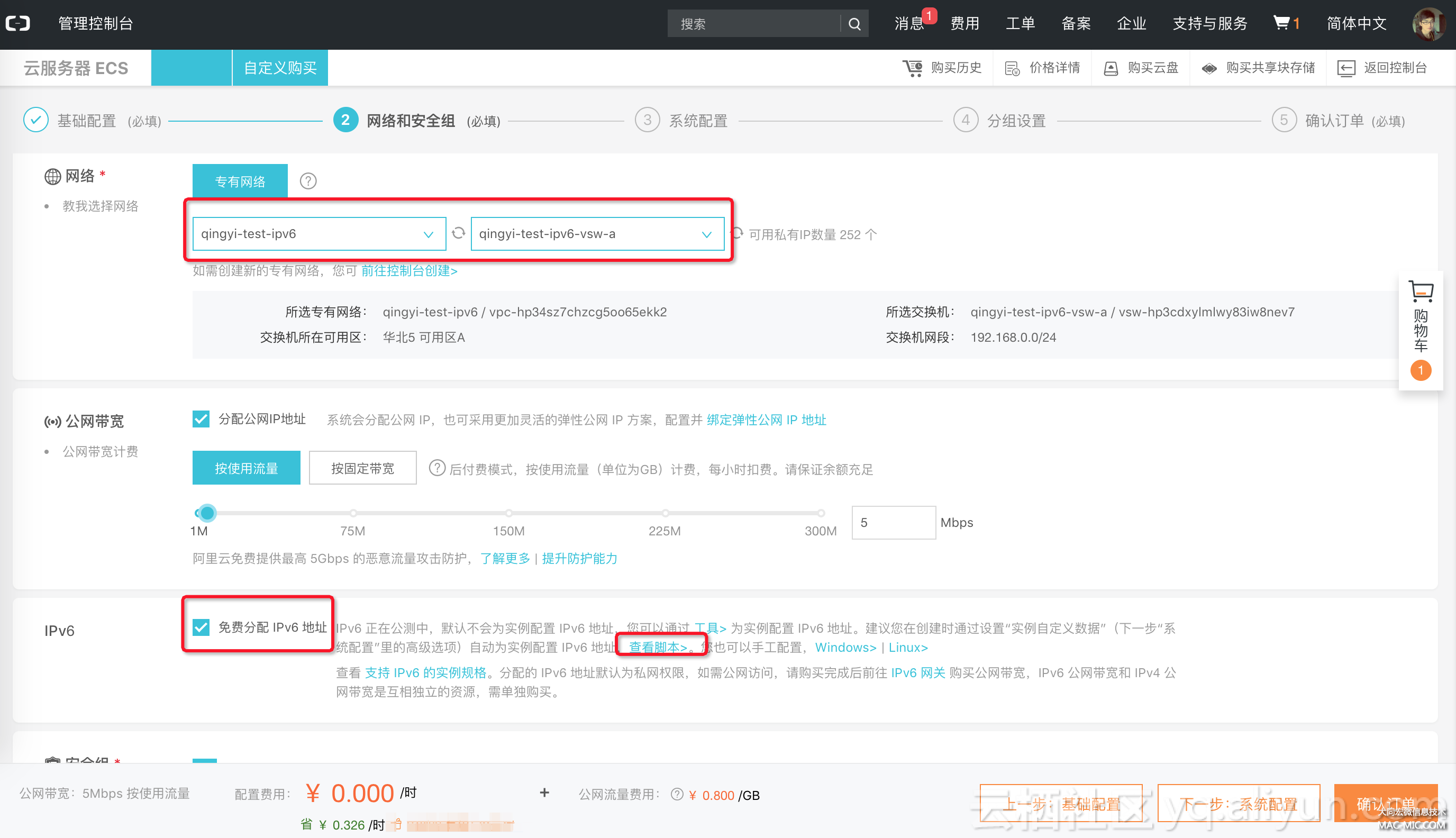 在第二步選擇剛創建好的 VPC / 交換機,然后勾選 免費分配 IPv6 地址,如下圖所示: