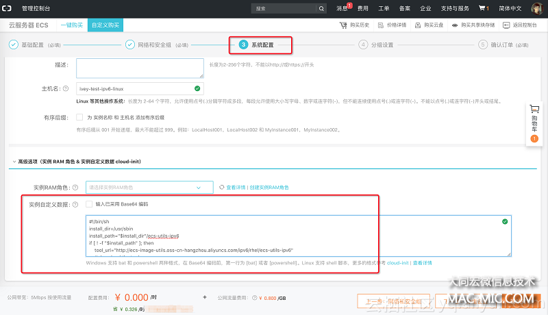 為了便于測試建議勾選 分配公網 IP 地址,此公網 IP 地址為 IPv4。根據頁面提示,在公測期間需要為實例配置 cloud-init 腳本即 實例自定義數據(暫時需要手工配置,未來系統會自動處理),如下圖所示: