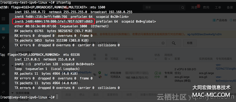 您可以通過 IPv4 公網 IP 登錄到機器上,ifconfig 查看 IPv6 地址,如下圖所示: