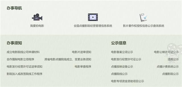 在國家電影局官網(wǎng)上,可以看到一些辦事導航,比如我要拍電影、全國點播影院經(jīng)營管理信息系統(tǒng)、影片著作權授權信息公示查詢系統(tǒng)等。